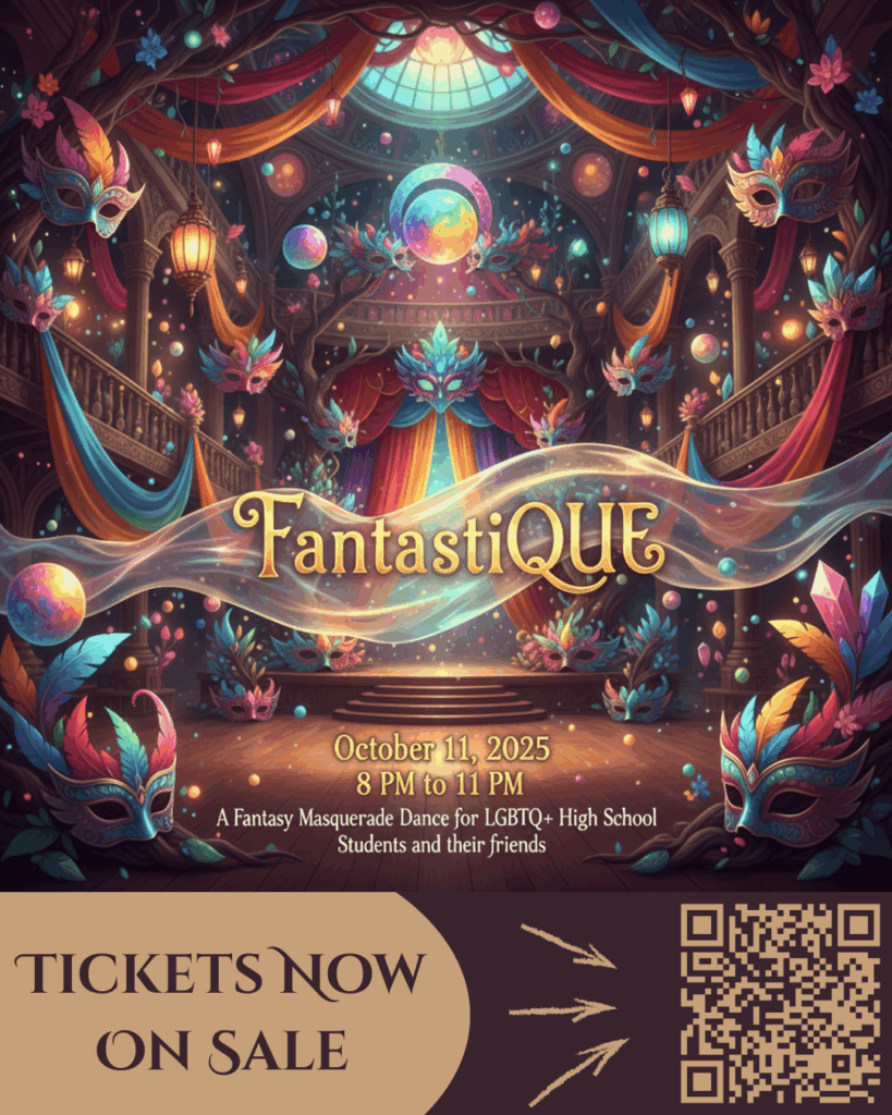 We are excited that our FantastiQUE Fantasy Masquerade Dance is happening Saturday, October 11, 2025. Please share the attached flyer to any networks where LGTBTQ+ high-school aged youth can have this brought to their attention.