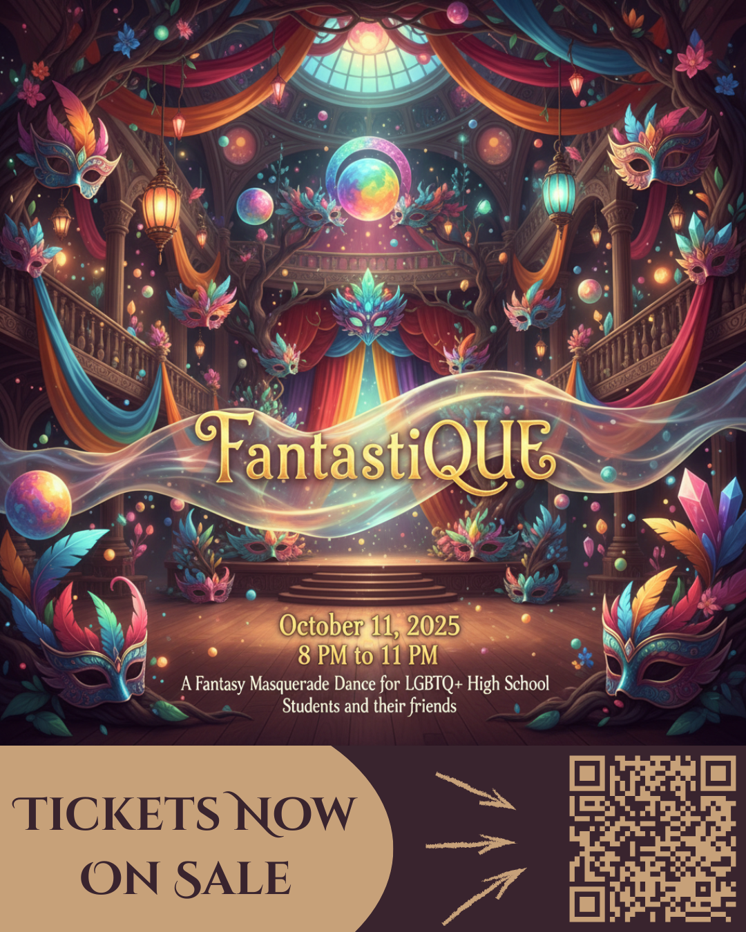 We are excited that our FantastiQUE Fantasy Masquerade Dance is happening Saturday, October 11, 2025. Please share the attached flyer to any networks where LGTBTQ+ high-school aged youth can have this brought to their attention.